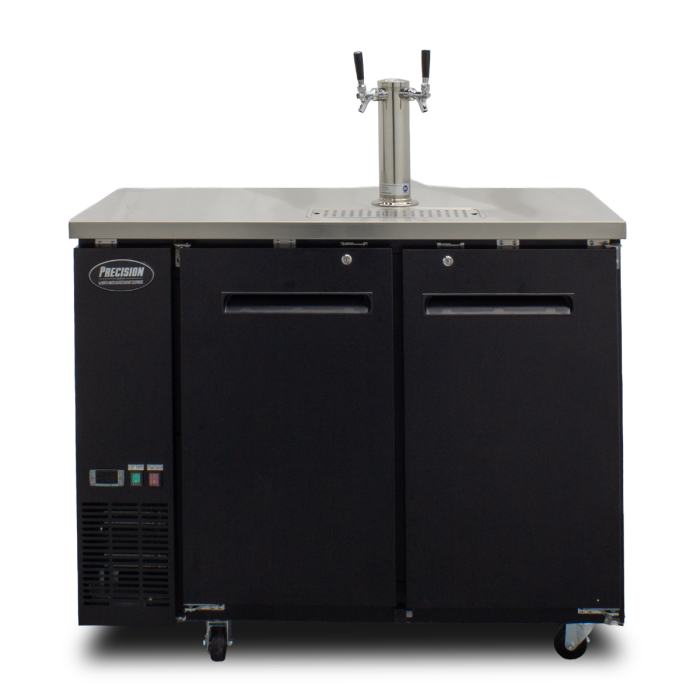 The Precision Series 48" Kegerator 2 Door Keg Refrigerator is engineered for optimal beer storage and dispensing, featuring a sturdy construction and intuitive controls. The dimensions of the unit are 48.5" L x 24.5" D x 36" H (without wheels). The tap system features a stainless steel double tap tower, with the flexibility to add additional taps if desired. The keg refrigerator is equipped with digital controls that maintain a temperature range of 33°F to 39°F, utilizing an efficient forced air refrigeration system. The warranty is comprehensive, offering 5 years for the compressor, 3 years for parts, and 1 year for labor.